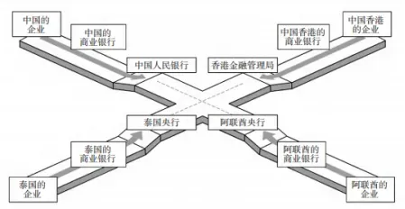 可见,mBridge的支付机制相对于现有的代理行支付体系有着明显的优势。第一,点对点支付能够有效提高交易效率和降低交易成本。如图2所示,一旦某国央行或货币当局加入mBridge项目,该国的商业银行就可以通过mBridge与其他法律辖区的银行进行点对点交易,不必通过多家代理行来完成交易。第二,支付系统交互可以防止市场分裂。参与mBridge项目的国家或地区不必一定要有CBDC,mBridge能够灵活地同传统支付系统对接。第三,支持本币支付有助于促进货币平等。在mBridge构架中,参与交易的双方可以直接用本币交易,不必使用第三方货币。这有助于培育交易双方货币的离岸市场,为小币种提供发展机会。