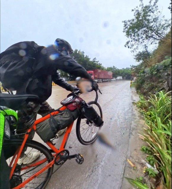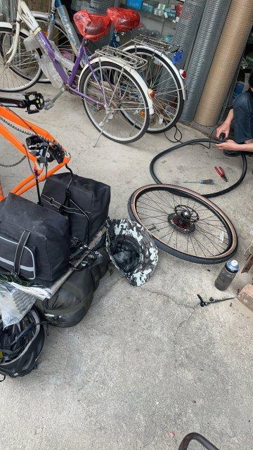 在福建省内国道上,才出发没几天,陈超20公里内就连爆三次车胎,他都用自带的工具补好轮胎。然而,第三次爆胎时打气筒突然失灵,他只能推着泄了气的车步行数公里找到修车铺。专业修车师傅发现频繁爆胎是因为外胎内的杂物没有清理干净,于是指导陈超在后面的路途上要如何补胎。