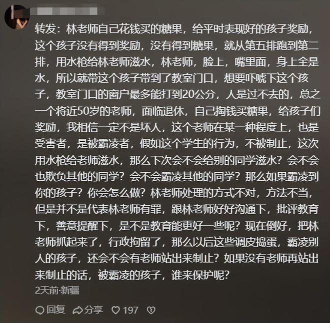 有这样的家长在,现在就算说这个学生当时就是故意朝着老师喷水枪的也不会怀疑了。