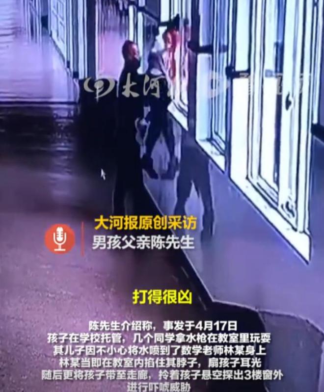 说是因为不满学生对自己喷水枪而进行刻意报复,对学生进行掐脖子、打耳光等暴力行为。