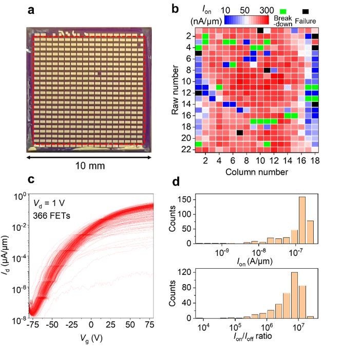 图2. 单层二硫化钼场效应晶体管阵列制备及电学性能。( a )全堆叠技术制备的单层MoS2场效应晶体管阵列;( b )396个单层MoS2晶体管的开态电流分布统计;( c-d )366个单层MoS2晶体管的转移特性曲线及开态电流、开关比统计分布(排除击穿及损坏器件)。